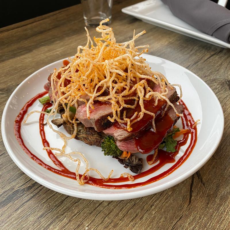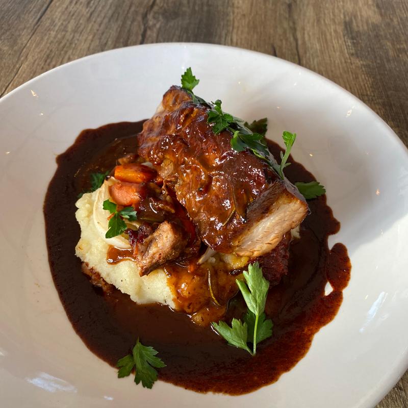 Garlic Confit Mashed Potatoes, Smoked Onions, Carrots, Red Currant Truffle Demi, Red Currant Sumac Syrup, Parsley / D GF