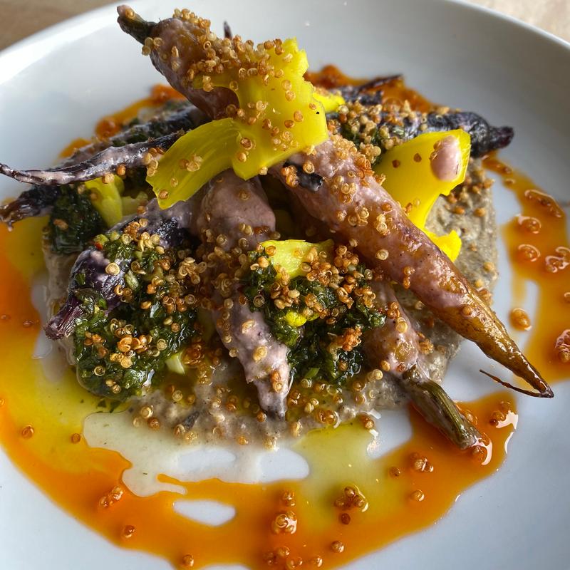 Baba Ganoush, Tamarind Coconut Sauce, Pickled Cauliflower, Chimichurri, Puffed Quinoa, Fresno Oil / V GF SS