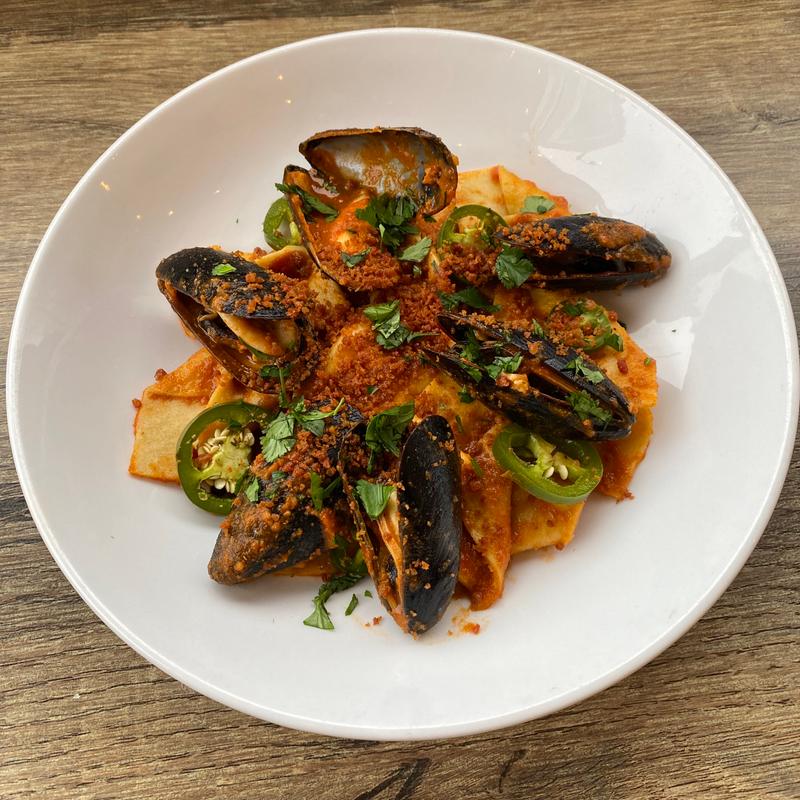 Barchette, Chorizo Tomato Sauce, Mussels, Pickled Jalapeno, Fried Chorizo, Cilantro I F SF
