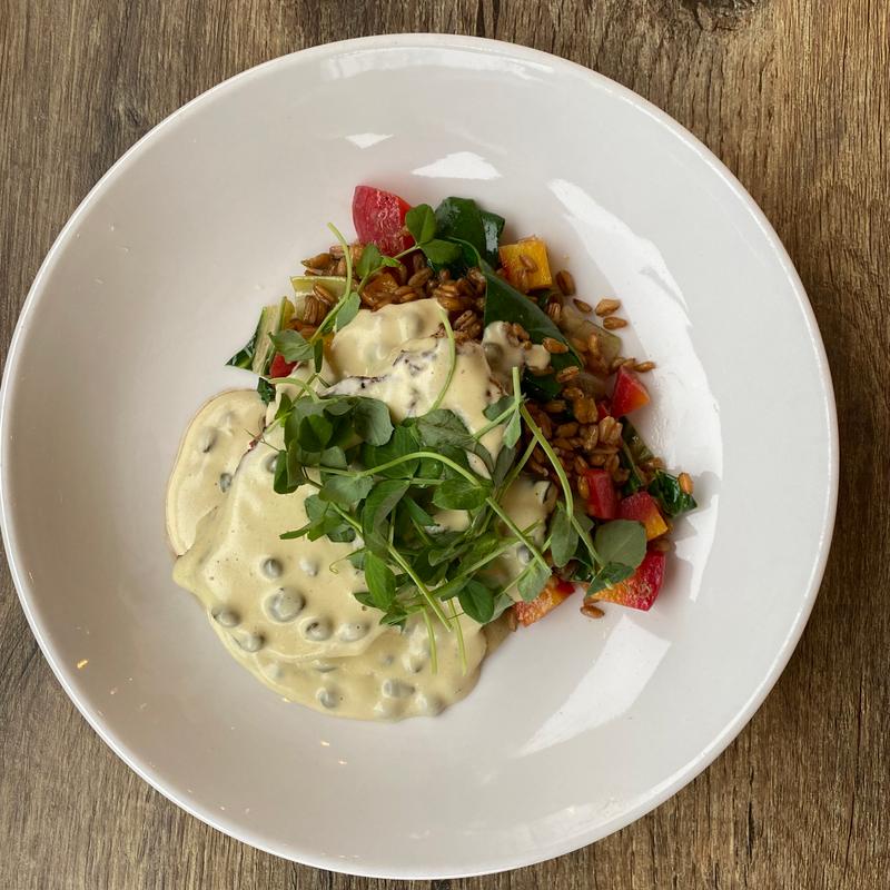 Farro, Mirepoix, Baby Chard, Beet, Cointreau Noir Caper Sauce, Pea Shoots I D F