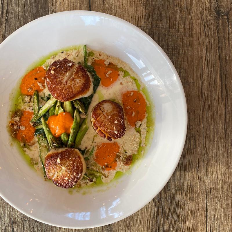 Three u-10 Scallops, Garlic Creamed Spinach, Asparagus, Red Pepper Coulis, Rye Crumble, Chive Oil / D SF