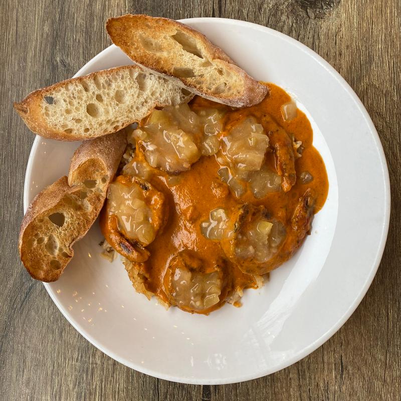 5 Blackened Shrimp, Dirty Rice, Étouffée Sauce, Apple Chutney, Circle City Sweets Baguette I D SF